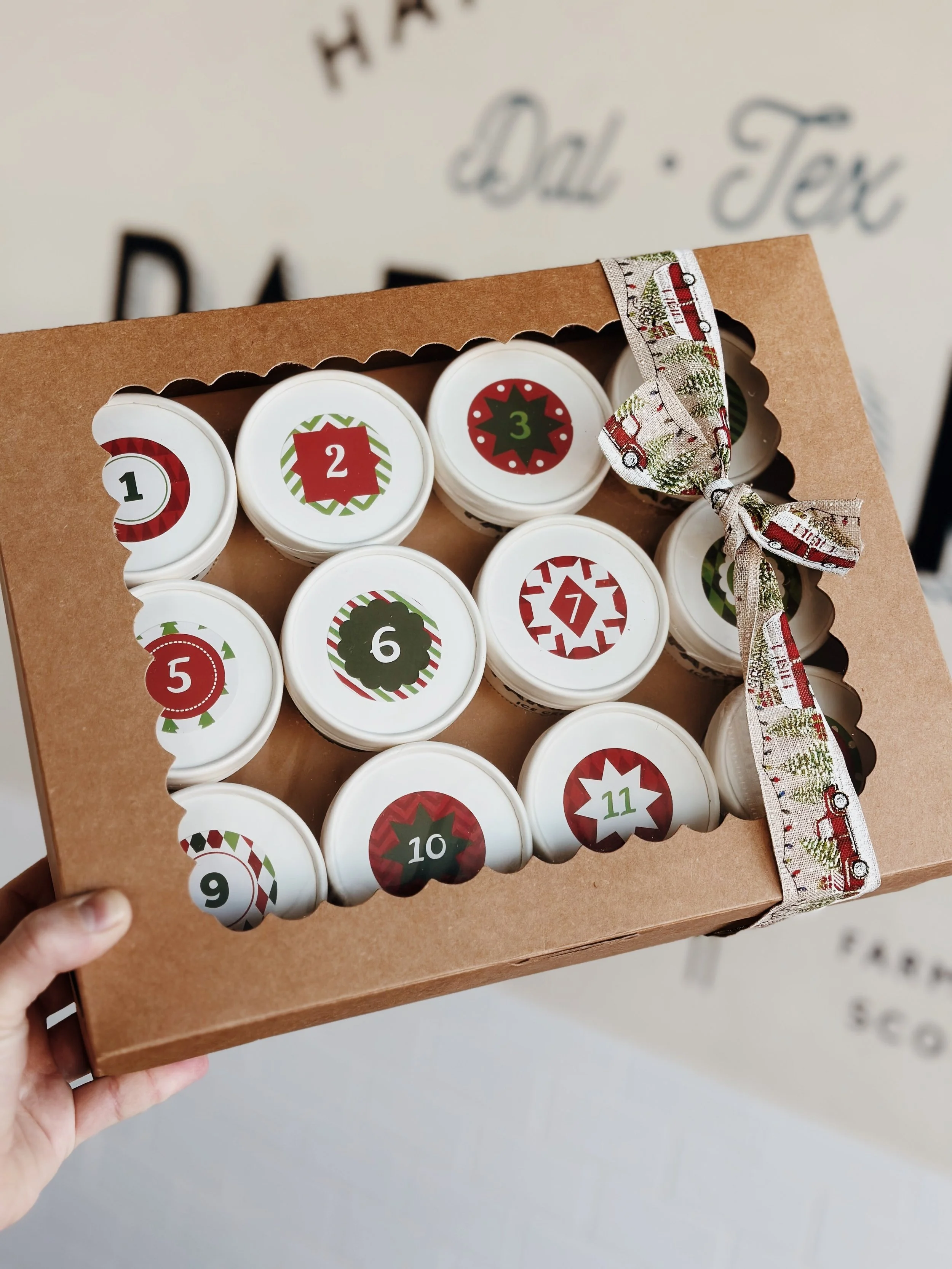 Pre-order your 12 Days of Ice Cream Advent Calendar to get you in the holiday spirit! Calendars include 12 different flavors of pre-packed single scoops including Classic and Seasonal Flavors. Scoops are labeled with a number for each day, so flavors are a secret unless you open up the card that comes with your calendar. Pre-orders for calendars are open until Tuesday, December 9th at midnight to ensure we have enough time to source, make, freeze, and pack your calendar scoops. Order pick up will be Wednesday, December 10th through Friday, December 12th during normal business hours.