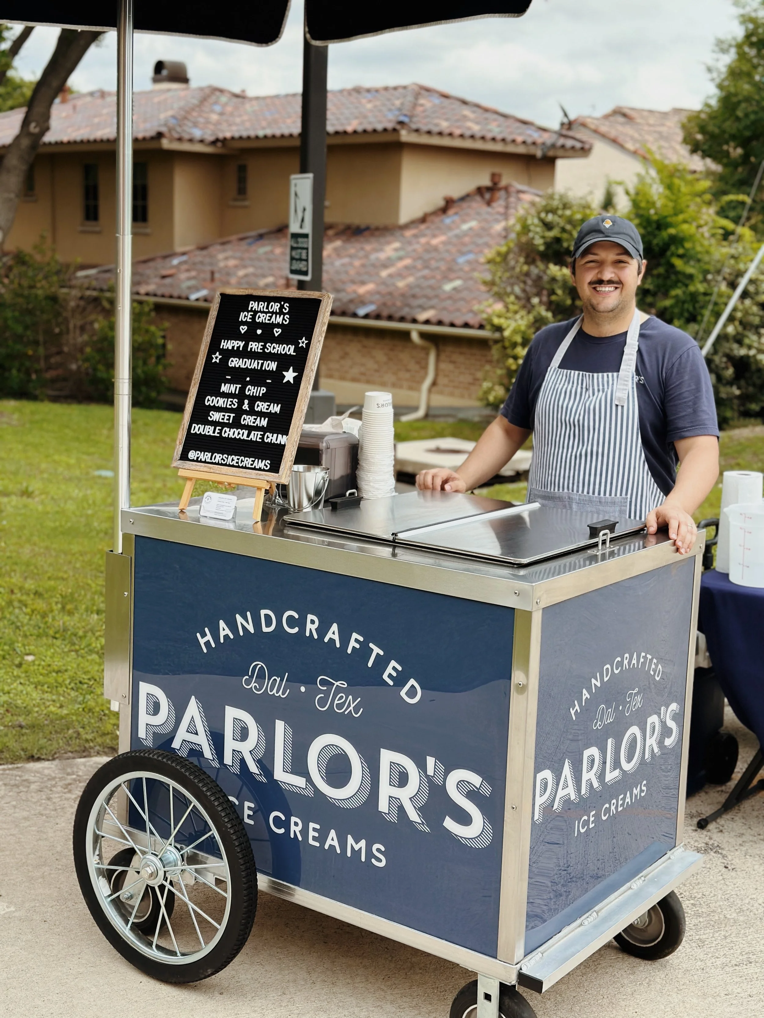 Whether it’s a small get together for a birthday party, an office event, or a wedding, booking our mobile scoop cart or branded cooler is a great way to serve high-quality ice cream to your guests. Our ice cream is handcrafted every week starting with the grass-fed milk & cream we get from a local farm all the way to the mix-ins we make by hand or buy from small Dallas businesses.